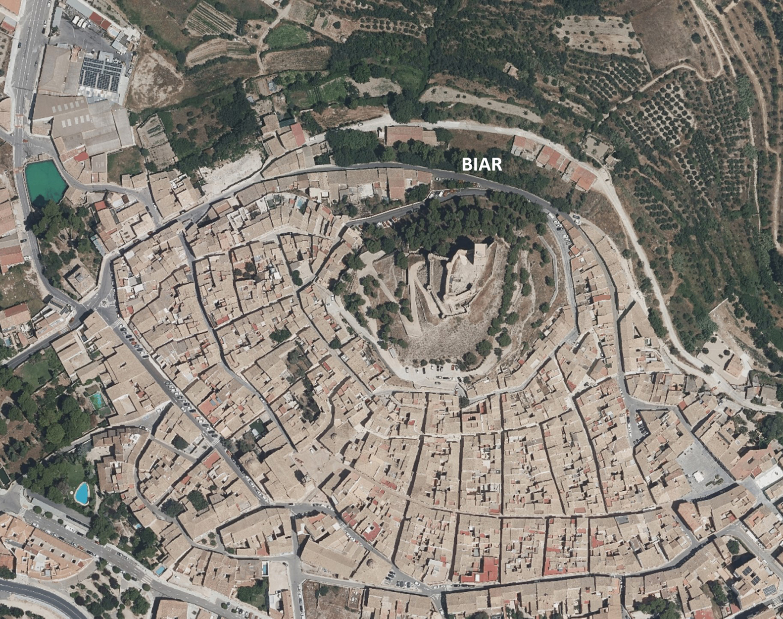 A pocos metros del cuidado centro histórico de Biar y ascendiendo ya sobre la montaña, aparecen una serie de edificaciones industriales y un colegio público que incluye dos edificios realizados entre los años setenta y ochenta.