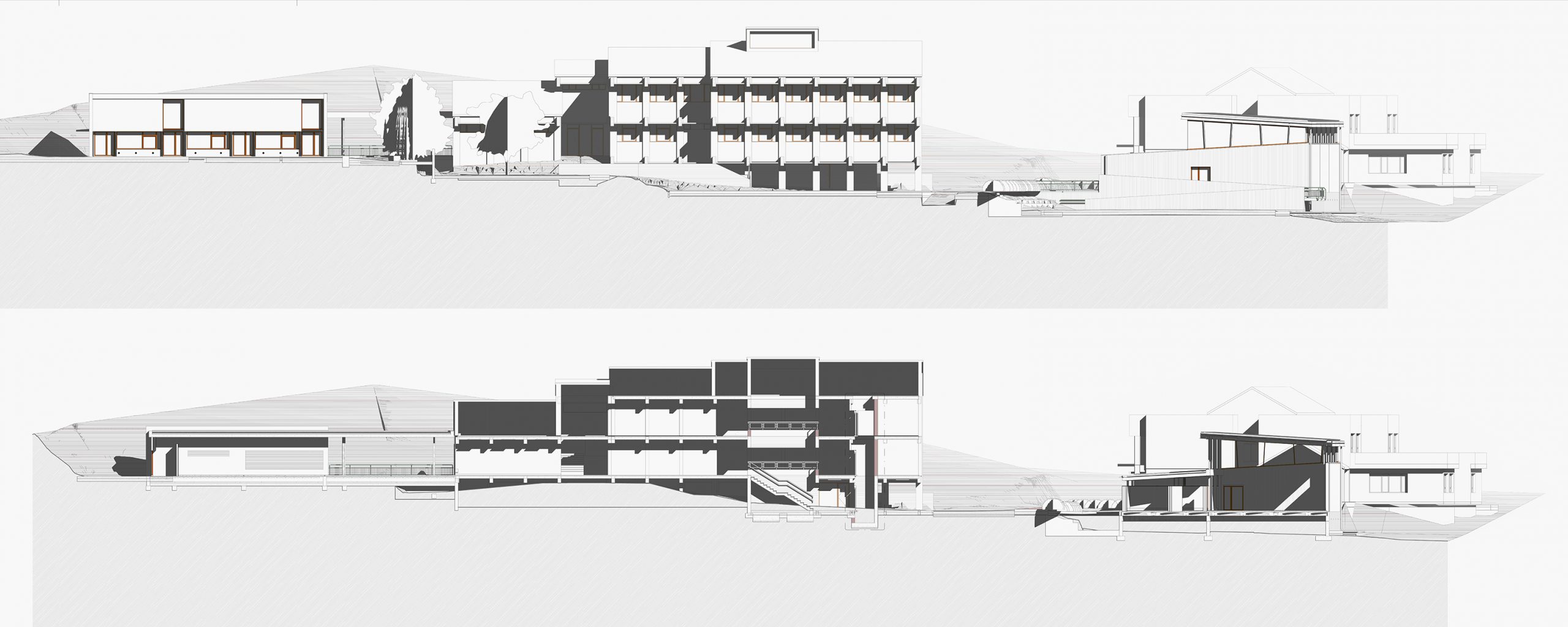 El gimnasio tiene su acceso en la fachada perpendicular al jardín, pero la inclinación de sus cubiertas se desliza en rampas que conducen hasta la pista deportiva. De esta forma, el edificio se constituye en un balcón que vierte al jardín y desde el que se podrán ver los juegos de esta pista situada en su plataforma más baja.